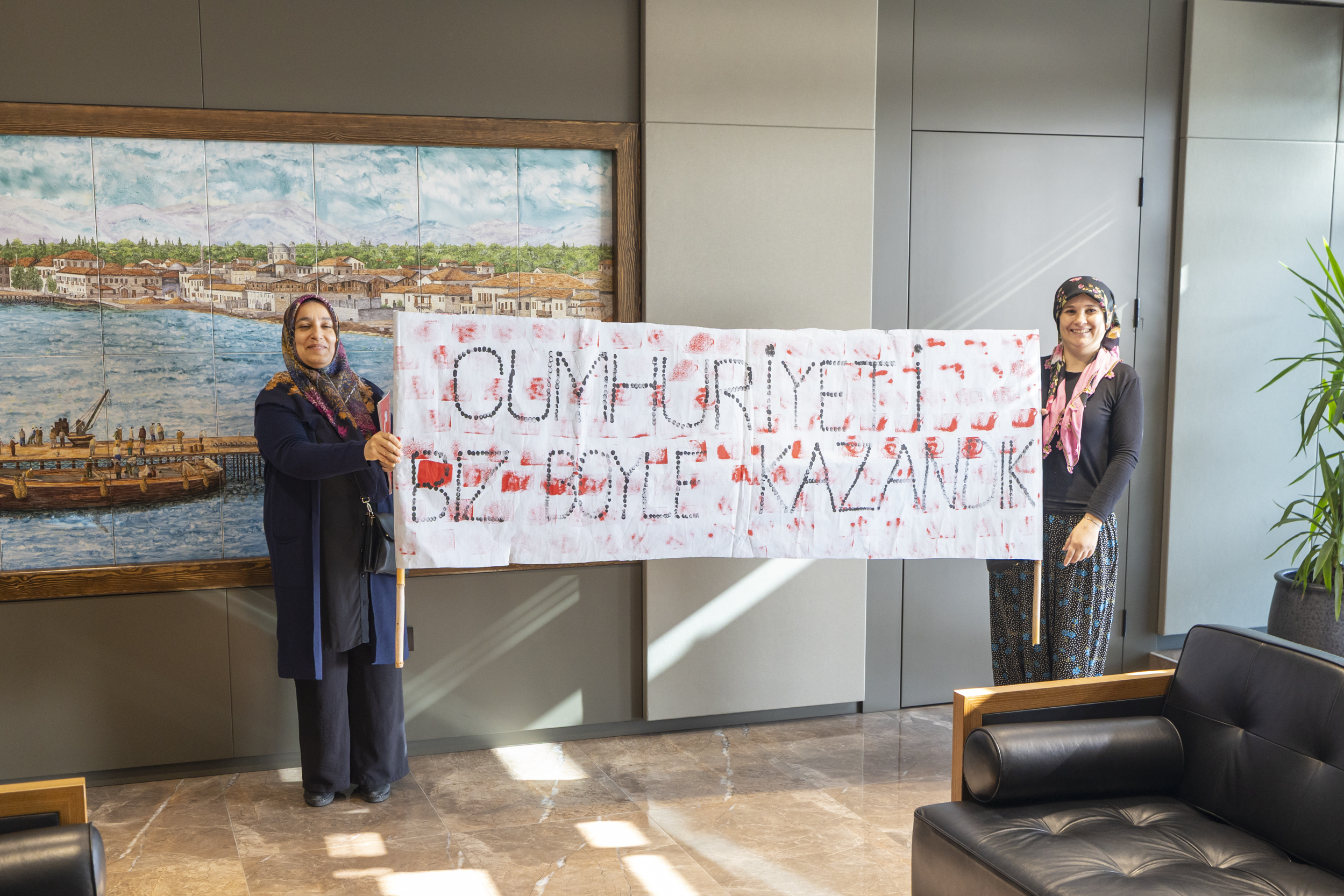 Minikler, ziyaretin sonunda Başkan Seçer’e de içeriğini kendi hazırlamış oldukları gazeteyi takdim etti. Öte yandan veliler ise atıl durumdaki bir pankartı yeniden düzenleyip, üzerine “Cumhuriyeti Biz Böyle Kazandık” yazısını ekleyerek görüşmeye katıldı.