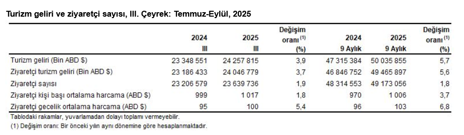 Türkiye İstatistik Kurumu’nun (TÜİK) verilerine göre, Turizm geliri Temmuz, Ağustos ve Eylül aylarından oluşan III. çeyrekte bir önceki yılın aynı çeyreğine göre yüzde 3,9 artarak 24 milyar 257 milyon 815 bin dolar oldu. Ziyaretçilerden elde edilen turizm geliri 24 milyar 46 milyon 779 bin dolar, transfer yolculardan elde edilen turizm geliri ise 211 milyon 37 bin dolar oldu. Ziyaretçilerin turizm gelirinin yüzde 16,1'ini ülkemizi ziyaret eden yurt dışı ikametli vatandaşlar oluşturdu.