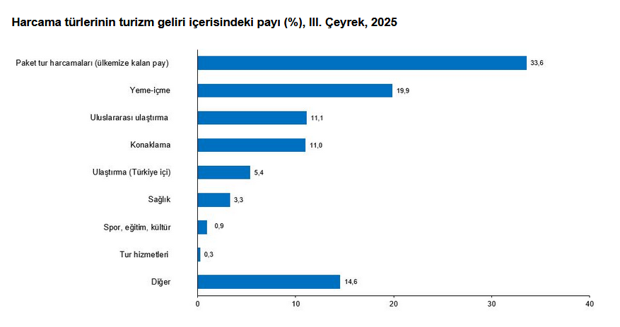Bu çeyrekte ziyaretçilerden elde edilen turizm geliri içerisindeki paket tur harcamalarının payı yüzde 33,6, yeme içme harcamalarının payı yüzde 19,9, uluslararası ulaştırma harcamalarının payı ise yüzde 11,1 oldu. Bir önceki yılın aynı dönemine göre sağlık harcamaları yüzde 20,3, konaklama harcamaları yüzde 17,3 ve yeme-içme harcamaları yüzde 14,8 arttı.