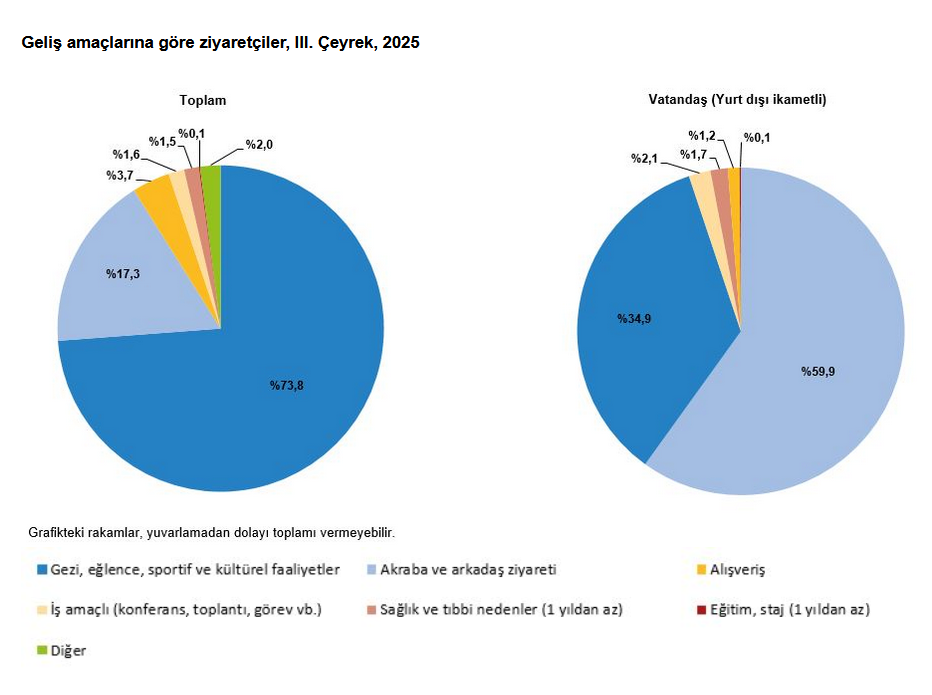 Türkiye'den çıkış yapan ziyaretçi sayısı 2025 yılı III. çeyreğinde bir önceki yılın aynı çeyreğine göre yüzde 1,9 artarak 23 milyon 639 bin 736 kişi oldu. Ziyaretçilerin yüzde 14,5'ini 3 milyon 438 bin 655 kişi ile yurt dışında ikamet eden vatandaşlar oluşturdu.