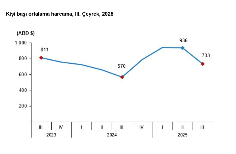 Bu çeyrekte yurt dışını ziyaret eden vatandaş sayısı bir önceki yılın aynı çeyreğine göre yüzde 3 artarak 3 milyon 383 bin 353 kişi oldu. Bunların kişi başı ortalama harcaması 733 dolar olarak gerçekleşti.