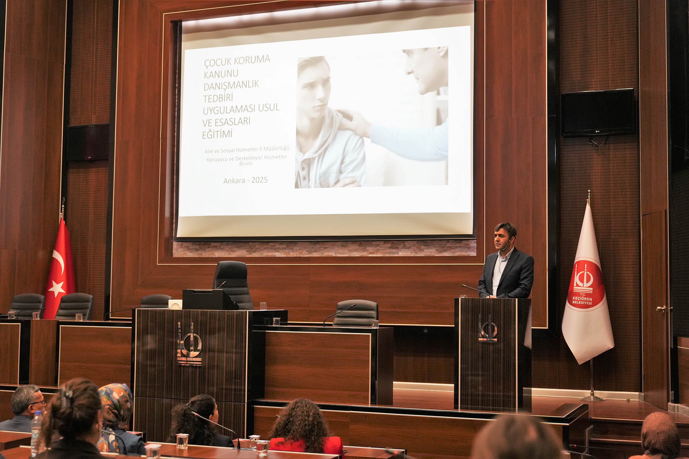 Belediye Meclis Salonu’nda gerçekleştirilen eğitime, Aile ve Sosyal Hizmetler İl Müdürlüğü’nde görev yapan Şube Müdürü Psikolog Adem Esen katılarak “5395 Sayılı Çocuk Koruma Kanunu” konulu sunum gerçekleştirdi.