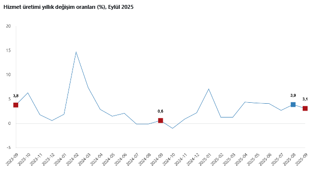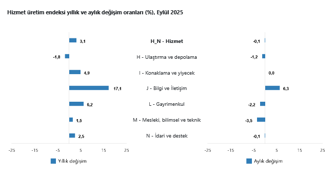 Hizmet üretim endeksi, Eylül'de yıllık bazda yüzde 3,1 arttı. Aynı ayda ulaştırma ve depolama hizmetleri yüzde 1,8 azalırken, konaklama ve yiyecek hizmetleri yüzde 4,9, bilgi ve iletişim hizmetleri yüzde 17,1, gayrimenkul hizmetleri yüzde 6,2, mesleki, bilimsel ve teknik hizmetler yüzde 1,5, idari ve destek hizmetleri ise yüzde 2,5 arttı.