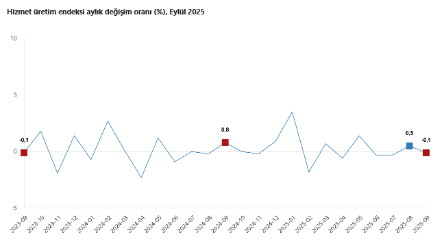 Hizmet üretim endeksi, Eylül'de aylık bazda yüzde 0,1 azaldı. Aynı ayda ulaştırma ve depolama hizmetleri yüzde 1,2 azalırken, konaklama ve yiyecek hizmetleri aynı kaldı, bilgi ve iletişim hizmetleri yüzde 6,3 arttı, gayrimenkul hizmetleri yüzde 2,2, mesleki, bilimsel ve teknik hizmetler yüzde 3,5, idari ve destek hizmetleri ise yüzde 0,1 azaldı.