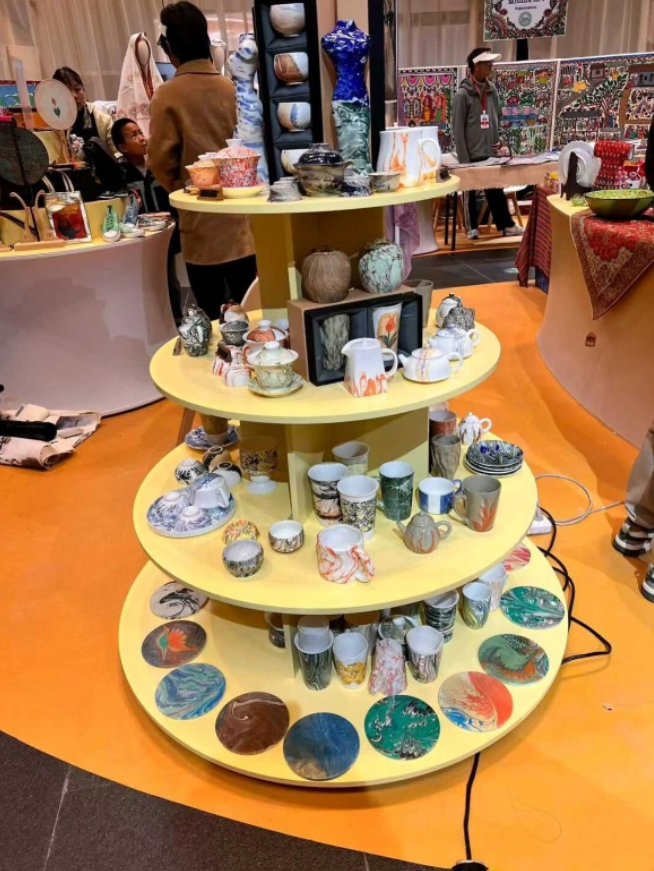 Guangzhou’dan Ebru sanatçıları şaşırtıcı yenilikler sundular. Seramik, ipek, deri çanta ve takılardan; kıyafet, ayakkabı ve şapkalara kadar birçok ürün, özellikle sanatçıların özgün Ebru tekniğiyle yaptıkları desenli Xiangyunsha ipek kumaşlar Çin ve Türkiye’nin sanatlarının özünü bütünleştirerek, somut olmayan kültürel miras becerilerinin çağdaş yaşamdaki sınırsız olasılığını ziyaret edenlere tanıttı.