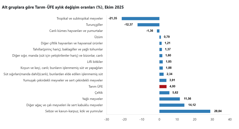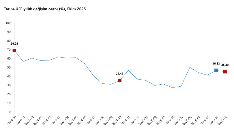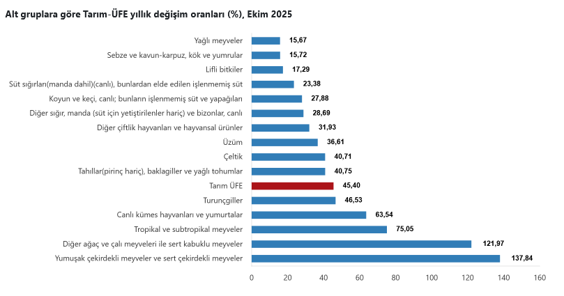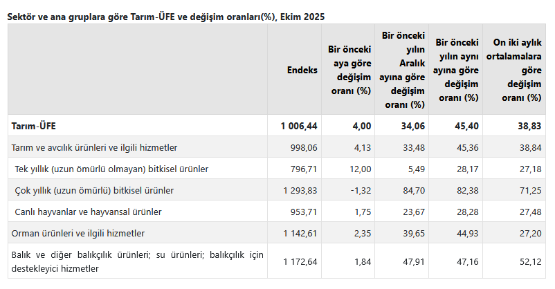 Türkiye İstatik Kurumu (TÜİK) verilerine göre, Tarım-ÜFE'de (2020=100), 2025 yılı Ekim'de aylık bazda yüzde 4,00 artış, bir önceki yılın Aralık ayına göre yüzde 34,06 artış, bir önceki yılın aynı ayına göre yüzde 45,40 artış ve on iki aylık ortalamalara göre yüzde 38,83 artış gerçekleşti.