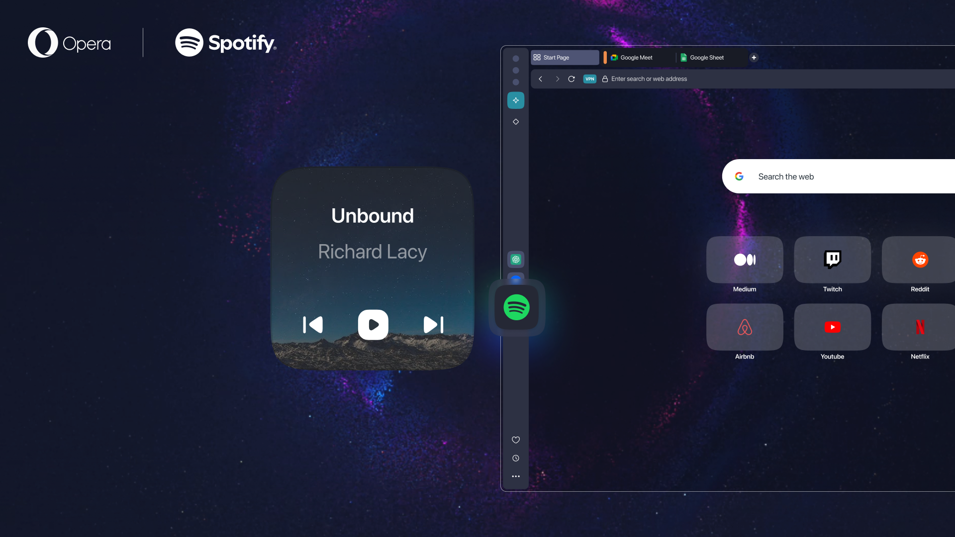 Opera’nın amiral gemisi masaüstü tarayıcısı Opera One, kullanıcıların müziklerini kesintiye uğratmadan tam kontrol sağlayabilmeleri için ekran üzerinde diledikleri gibi taşıyabilecekleri ayrılabilir bir Müzik Çalar ile geliyor. Spotify, Müzik Çalar’ın varsayılan servisi olarak belirlenirken, Türkiye’deki kullanıcılara ise 3 aylık Spotify Premium üyeliğini 99 TL’ye kullanma fırsatı sunuluyor.