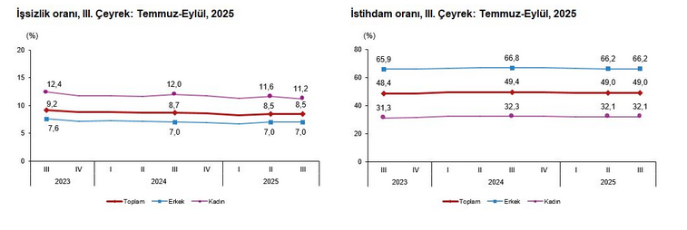 Hanehalkı İşgücü Araştırması sonuçlarına göre; 15 ve daha yukarı yaştaki kişilerde işsiz sayısı 2025 yılı üçüncü çeyreğinde bir önceki çeyreğe göre 26 bin kişi azalarak 3 milyon 10 bin kişi oldu. İşsizlik oranı ise değişim göstermeyerek yüzde 8,5 seviyesinde gerçekleşti. İşsizlik oranı erkeklerde yüzde 7,0, kadınlarda yüzde 11,2 olarak tahmin edildi.