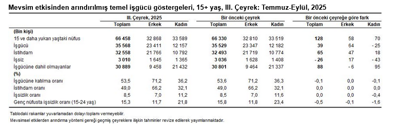 İşgücü, 2025 yılı üçüncü çeyreğinde bir önceki çeyreğe göre 39 bin kişi artarak 35 milyon 568 bin kişi, işgücüne katılma oranı ise 0,1 puanlık azalış ile yüzde 53,5 olarak gerçekleşti. İşgücüne katılma oranı erkeklerde yüzde 71,2, kadınlarda ise yüzde 36,2 oldu.