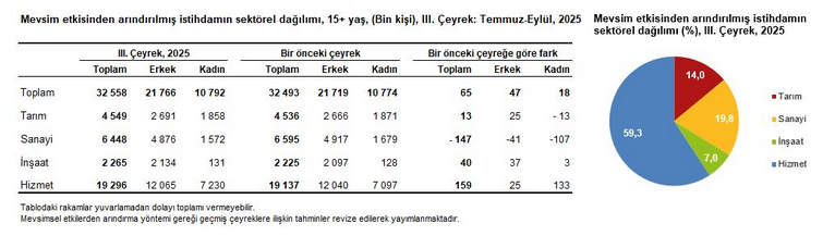 Mevsim etkisinden arındırılmış istihdam edilenlerin sayısı 2025 yılı üçüncü çeyreğinde bir önceki çeyreğe göre tarım sektöründe 13 bin kişi, inşaat sektöründe 40 bin kişi, hizmet sektöründe 159 bin kişi artarken, sanayi sektöründe 147 bin kişi azaldı. İstihdam edilenlerin yüzde 14,0'ı tarım, yüzde 19,8'i sanayi, yüzde 7,0'ı inşaat, yüzde 59,3'ü ise hizmet sektöründe yer aldı.