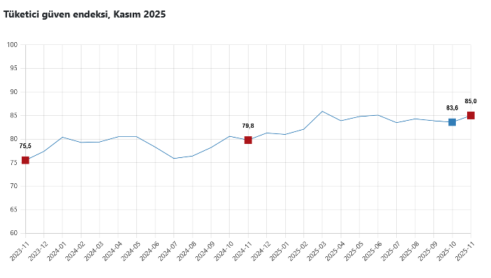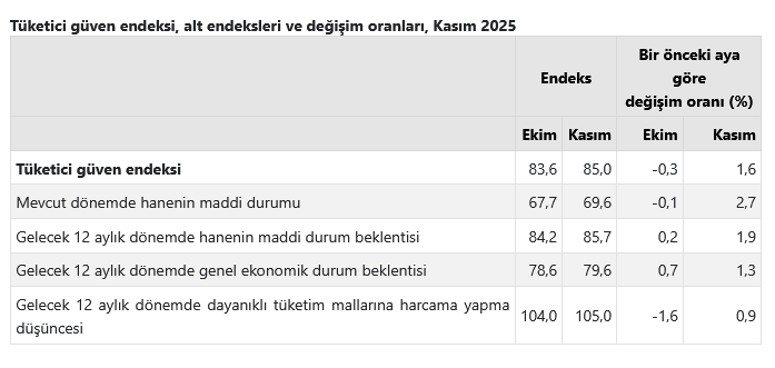 Türkiye İstatistik Kurumu (TÜİK) ve Türkiye Cumhuriyet Merkez Bankası (TCMB) iş birliği ile yürütülen tüketici eğilim anketi sonuçlarından hesaplanan tüketici güven endeksi, Ekim ayında 83,6 iken Kasım ayında yüzde 1,6 artarak 85,0'a yükseldi.