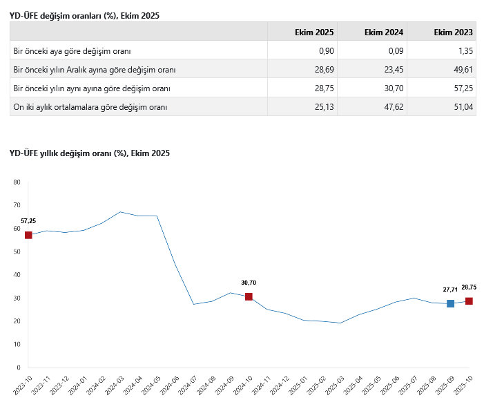 Türkiye İstatistik Kurumu (TÜİK) verilerine göre, Yurt Dışı Üretici Fiyat Endeksi (YD-ÜFE) Ekim'de aylık bazda yüzde 0,90, bir önceki yılın Aralık ayına göre yüzde 28,69, yıllık bazda yüzde 28,75 ve on iki aylık ortalamalara göre yüzde 25,13 arttı.