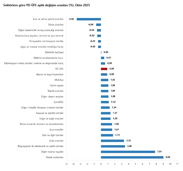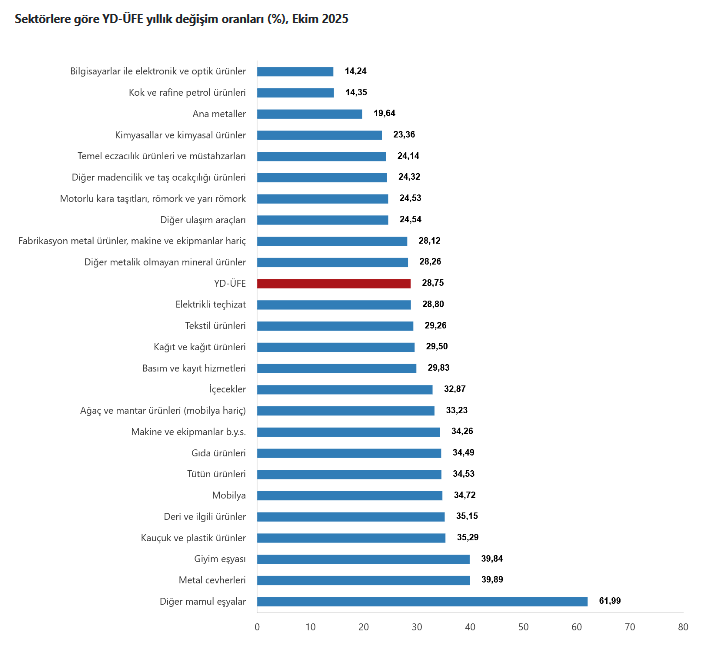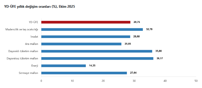 Ana sanayi gruplarının yıllık değişimleri; ara malları yüzde 25,85, dayanıklı tüketim malları yüzde 35,80, dayanıksız tüketim malları yüzde 36,17, enerji yüzde 14,35, sermaye malları yüzde 27,64 yükseldi.