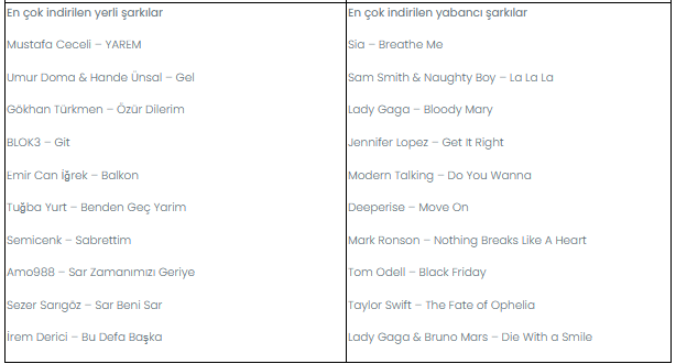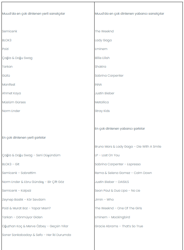 Muud kullanıcılarının favori listelerinde Semicenk bu ayın da yükselen yıldızı olarak öne çıktı. En çok dinlenen yerli sanatçı listesinde Semicenk ilk sırada yer aldı. Son dönemlerin popüler isimleri Çağla ve Doğu Swag’ın seslendirdiği “Seni Düşündüm” isimli düet ise en çok dinlenen yerli şarkı listesinde zirveye ulaştı.