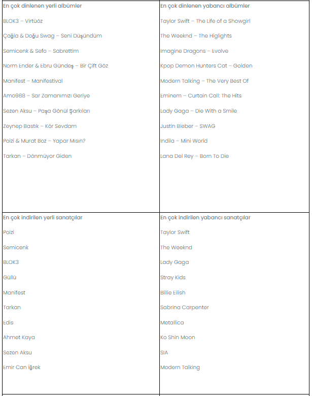 Lady Gaga ve Bruno Mars’ın “Die With A Smile” düeti, ekim ayında en çok dinlenen yabancı şarkı listesinde birinci sırada yer aldı. The Weeknd ayın en çok dinlenen sanatçısı olurken en çok indirilen yabancı şarkı ise Sia’nın “Breathe Me” parçası oldu. Taylor Swift ise ekim ayında yabancı listelerde hem en çok indirilen hem de en çok dinlenen yabancı albüm olarak zirveye adını yazdırdı.