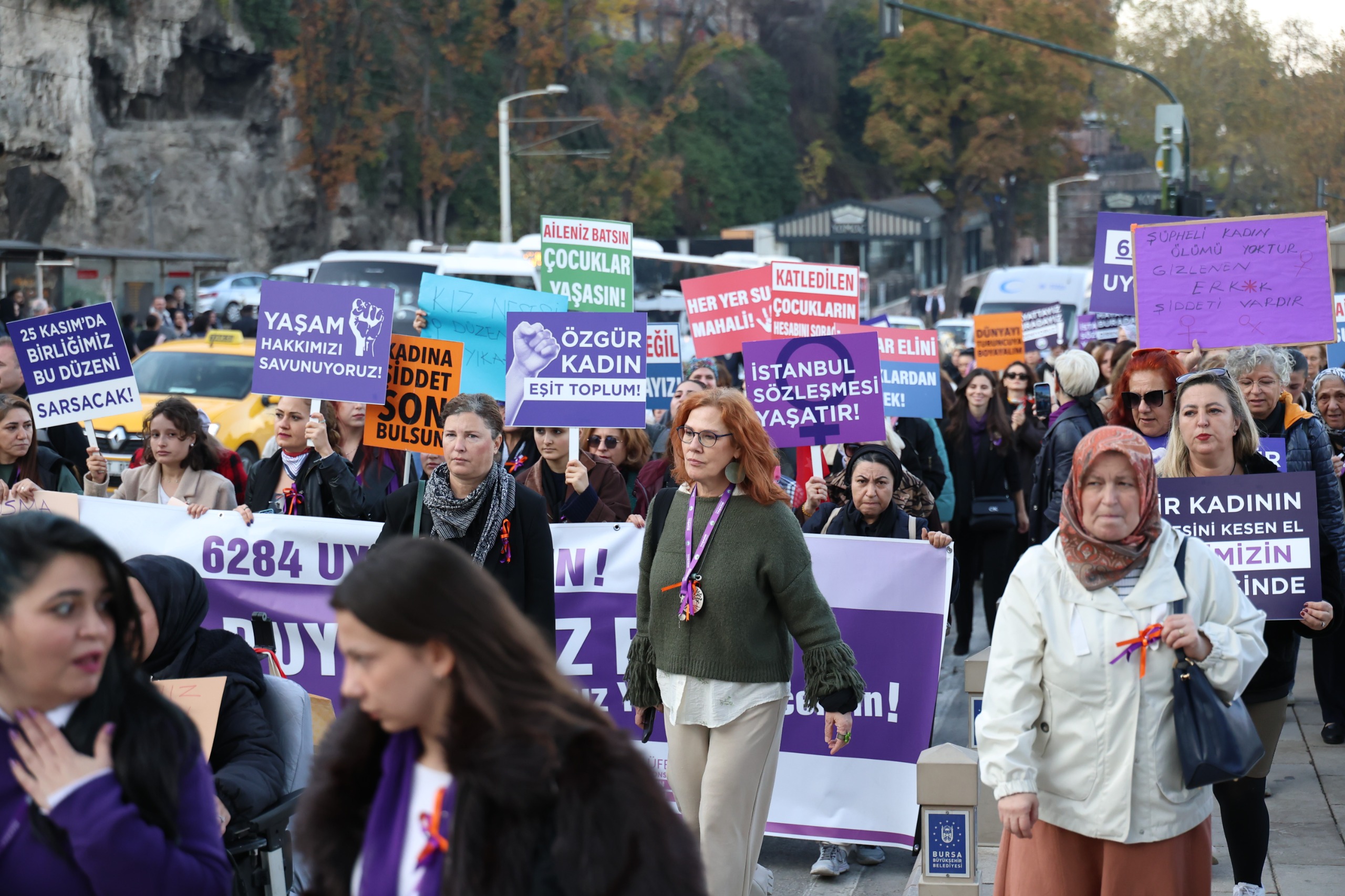 Bursa’da binlerce kadın, 25 Kasım Kadına Yönelik Şiddete Karşı Uluslararası Mücadele Günü’nde kadın haklarını savunmak, şiddetsiz bir yaşam, adalet ve eşitlik için sokaklara çıkarak sloganlar eşliğinde yürüyüş yaptı.