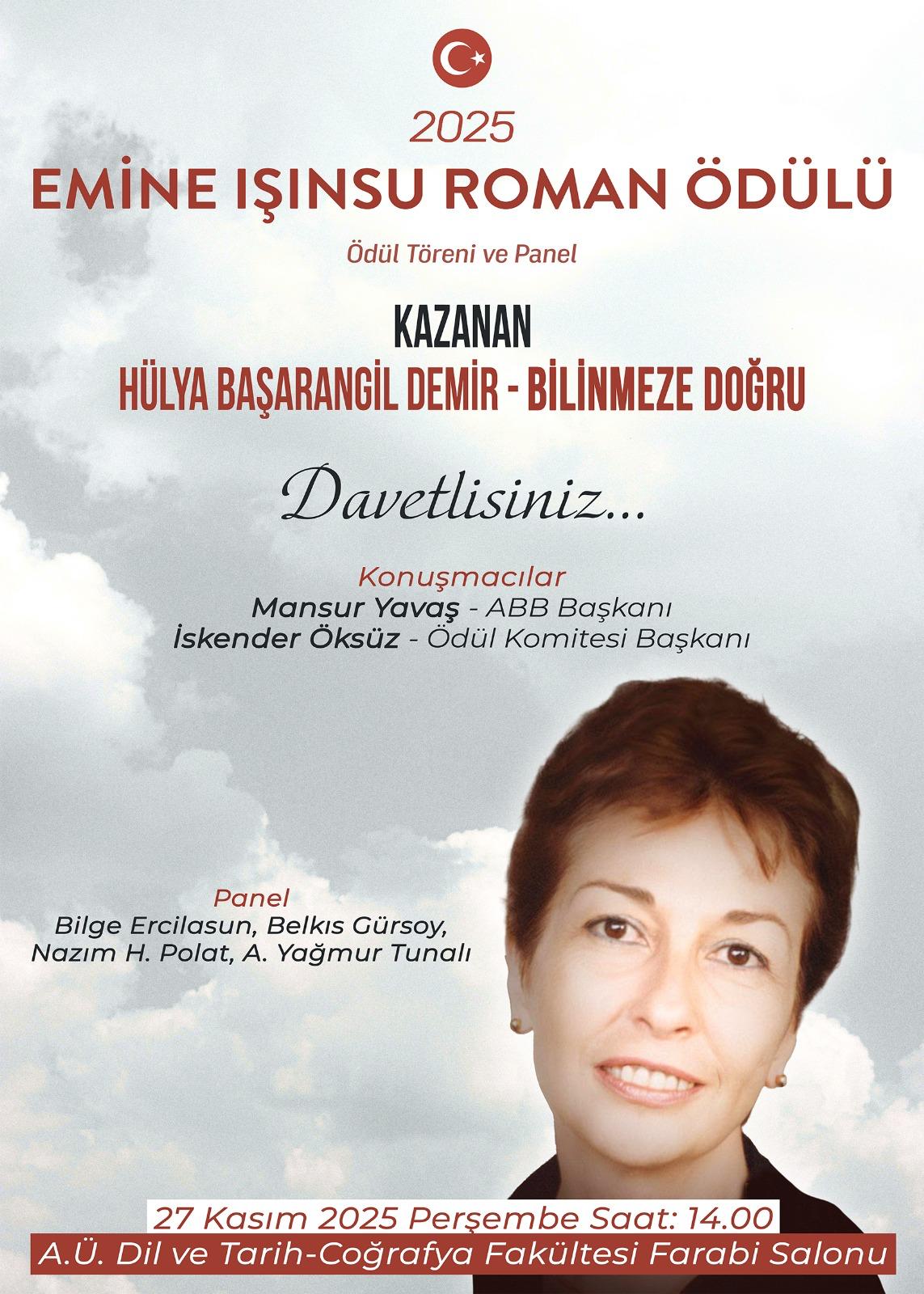Murat Ali Sakal – 25 Kasım (Hibya) – 2025 Emine Işınsu Roman Ödülü’nü “Bilinmeze Doğru” adlı eseriyle kazanan Hülya Başarangil Demir’e beratı, 27 Kasım Perşembe günü düzenlenecek törenle takdim edilecek.