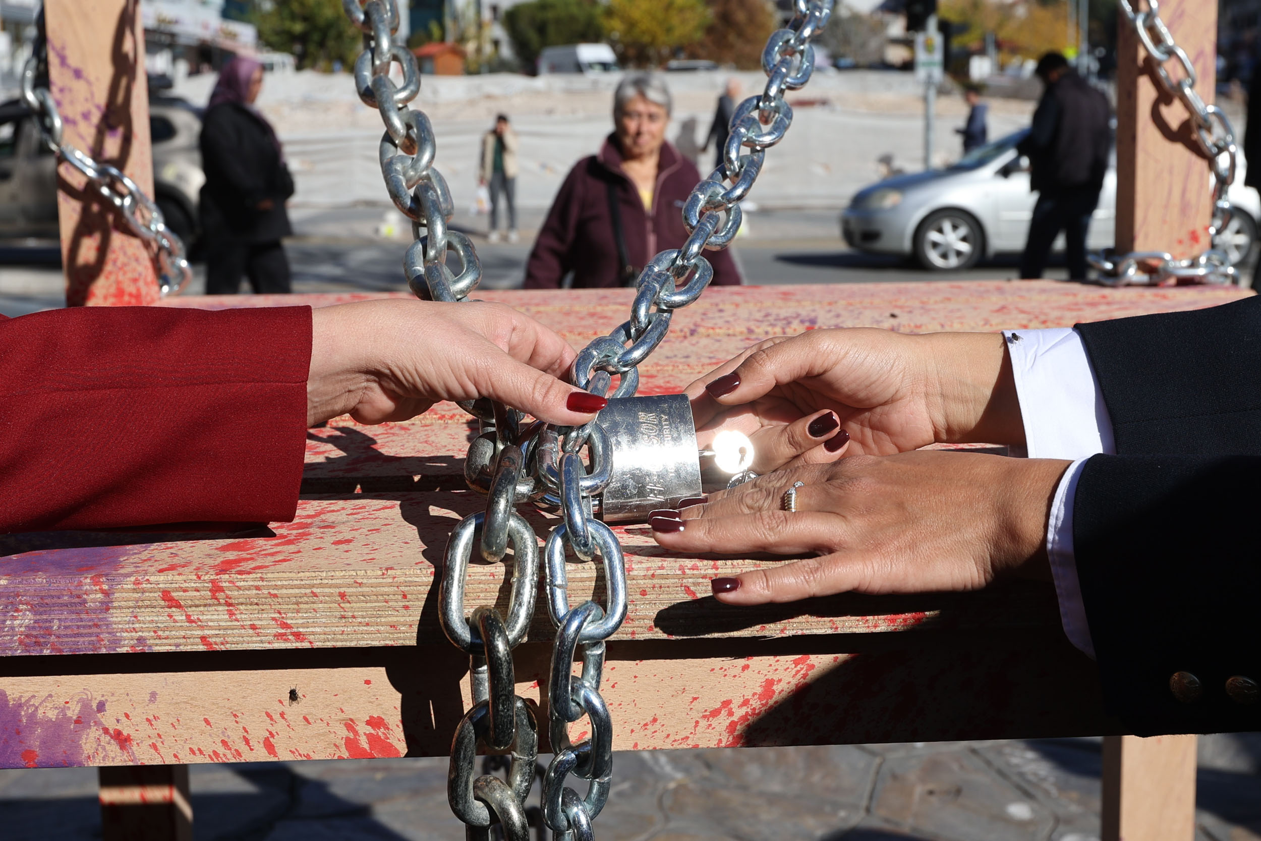 Muğla’nın 13 ilçesinde eş zamanlı olarak kamusal alanlara yerleştirilen zincirli boş sandalyeler ile kadına yönelik şiddetin hem görünür hem de görünmeyen boyutlarına dikkat çekilmesi amaçlandı. Etkinlik süresince vatandaşlara bilgilendirme yapıldı.