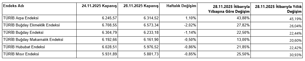 TÜRİB Buğday Ekmeklik Endeksi: 24.11.2025 6.708,55 seviyesinde, 28.11.2025 günü ise 6.573,34 seviyesinde kapanmıştır. Haftalık değişim -yüzde 2,02, yıllık değişim yüzde 26,04 olmuştur.