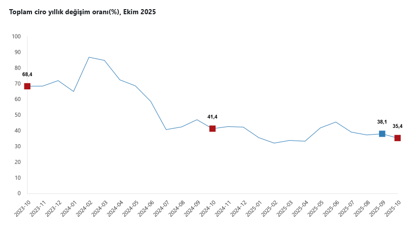 Türkiye İstatistik Kurumu’nun (TÜİK) verilerine göre; sanayi, inşaat, ticaret ve hizmet sektörleri toplamında ciro endeksi (2021=100), 2025 yılı Ekim ayında yıllık yüzde 35,4 yükseldi.