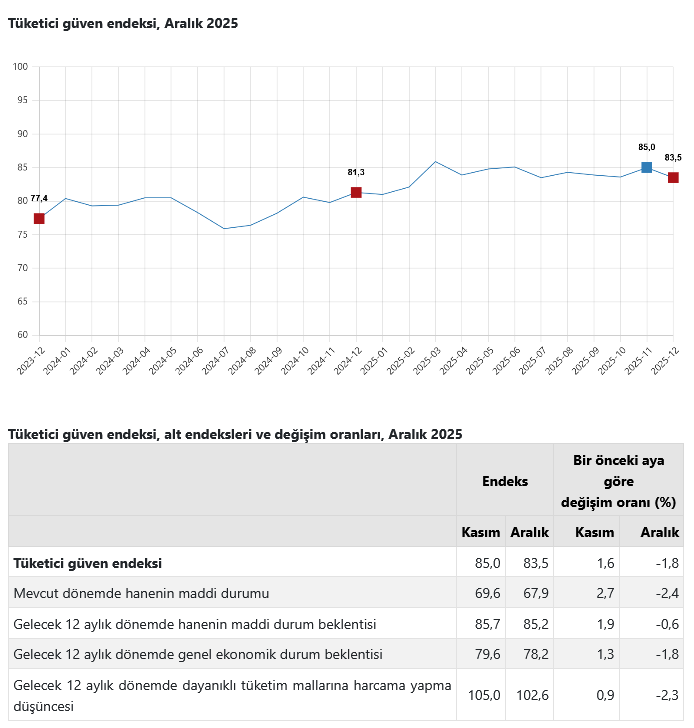 Türkiye İstatistik Kurumu (TÜİK) ve Türkiye Cumhuriyet Merkez Bankası (TCMB) iş birliği ile yürütülen tüketici eğilim anketi sonuçlarından hesaplanan tüketici güven endeksi, Kasım ayında 85,0 iken Aralık ayında yüzde 1,8 azalarak 83,5'e düştü.