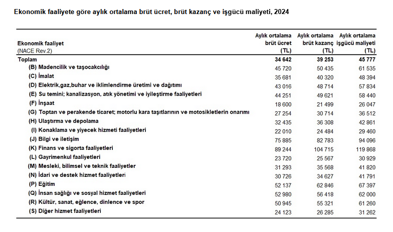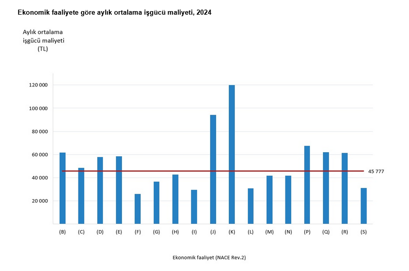 Türkiye İstatistik Kurumu (TÜİK) verilerine göre, İşgücü Maliyeti İstatistikleri sonuçlarına göre 2024 yılında aylık ortalama işgücü maliyeti 45 bin 777 TL olarak gerçekleşti.