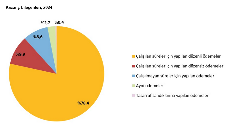 Çalışılan süreler için yapılan düzenli ödemeler yüzde 78,4'lük oranla kazanç bileşenleri içinde en büyük paya sahip oldu. Çalışılan süreler için yapılan düzensiz ödemelerin payı yüzde 9,9 olarak gerçekleşirken çalışılmayan süreler için yapılan ödemelerin payı yüzde 8,6 oldu. Ayni ödemelerin kazanç içindeki payı yüzde 2,7 olarak gerçekleşti. Tasarruf sandıklarına yapılan ödemelerin payı ise yüzde 0,4 oldu.