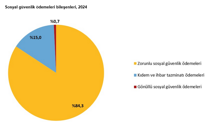 Sosyal güvenlik ödemeleri içinde en büyük payı yüzde 84,3 oranıyla zorunlu sosyal güvenlik ödemeleri alırken, gönüllü sosyal güvenlik ödemelerinin oranı yüzde 0,7 olarak gerçekleşti. Kıdem ve ihbar tazminatı ödemelerinin oranı ise yüzde 15,0 olarak gerçekleşti.