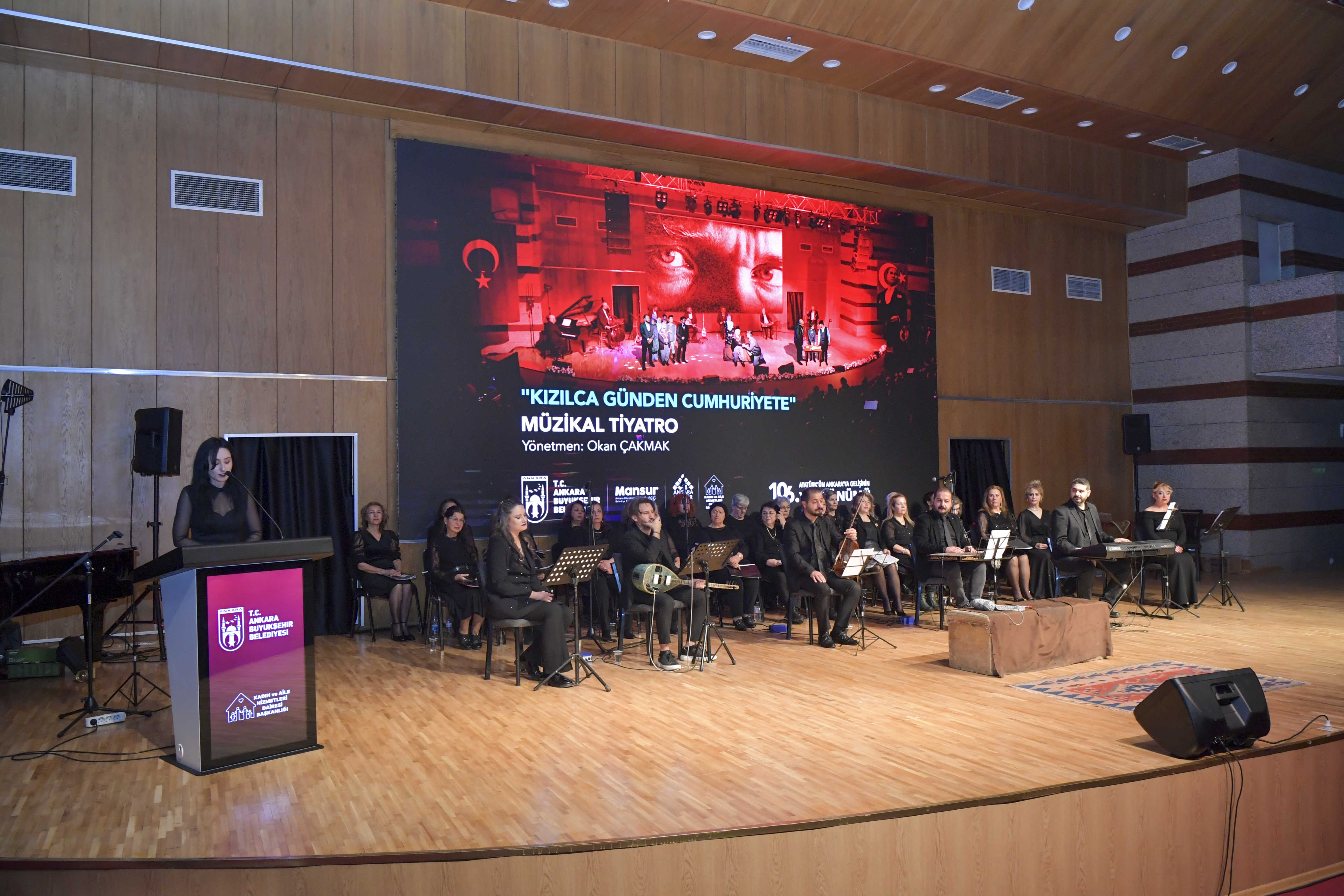 Kutlamalar kapsamında, ABB Kadın ve Aile Hizmetleri Daire Başkanlığı tarafından Kocatepe Kültür Merkezi’nde ücretsiz olarak sahnelenen “Kızılca Günden Cumhuriyete” adlı müzikal tiyatro izleyicilerle buluştu.