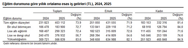 Eğitim durumuna göre yıllık ortalama esas iş gelirleri sırasıyla yükseköğretim mezunlarında 566 bin 839 TL, lise ve dengi okul mezunlarında 376 bin 932 TL, lise altı eğitimlilerde 290 bin 323 TL, bir okul bitirmeyenlerde 183 bin 900 TL olarak hesaplandı. Geçen yıla göre yıllık ortalama esas iş gelirinde en yüksek artış yüzde 83,0 ile yükseköğretim, en düşük artış ise yüzde 56,7 ile lise ve dengi okul mezunlarında oldu.