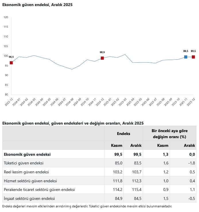 Türkiye İstatistik Kurumu’nun (TÜİK) verilerine göre, ekonomik güven endeksi Aralık'ta aynı düzeyde kalarak 99,5 değerini aldı.