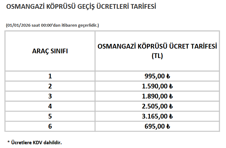 Karayolları Genel Müdürlüğünce ve Kamu Özel İşbirliği (KÖİ) kapsamında özel şirketler tarafından işletilen otoyol ve köprülerin geçiş ücretleri, 1 Ocak 2026 Perşembe günü saat 00.00’dan itibaren geçerli olmak üzere yeniden düzenlendi. Ücret tarifelerinden bazıları şu şekilde: