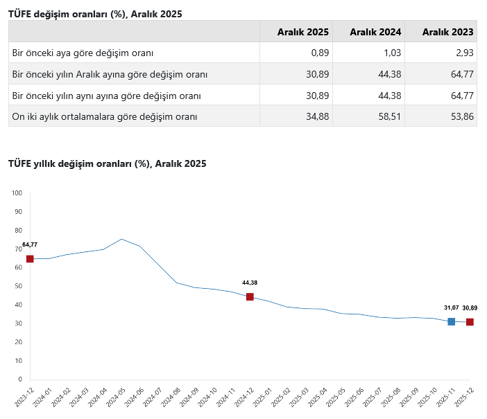 (Ayrıntılarla yenilendi) Türkiye İstatistik Kurumu’nun (TÜİK) verilerine göre, TÜFE, Aralık'ta aylık bazda yüzde 0,89, bir önceki yılın Aralık ayına göre yüzde 30,89, yıllık bazda yüzde 30,89 ve on iki aylık ortalamalara göre yüzde 34,88 arttı.
