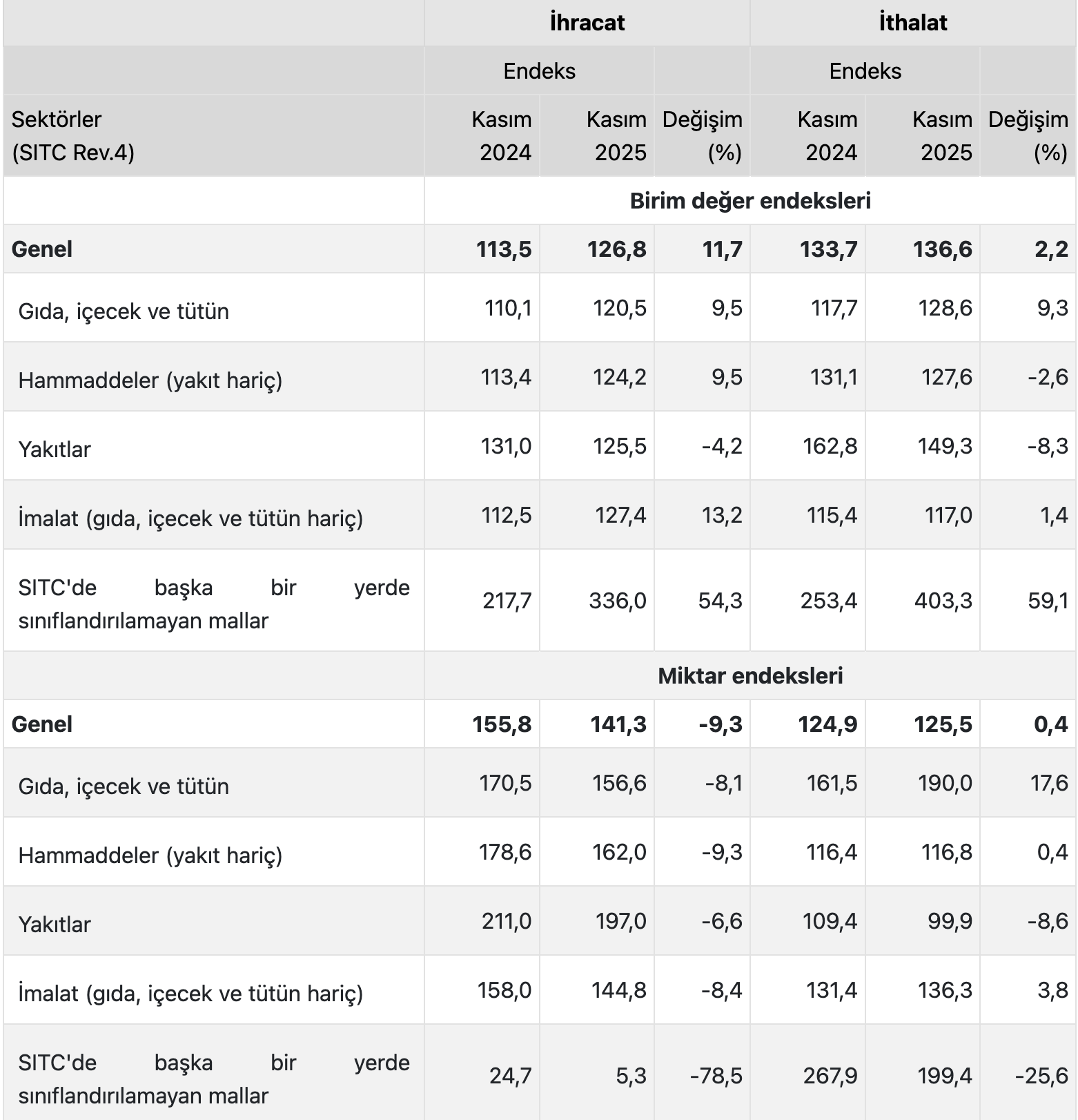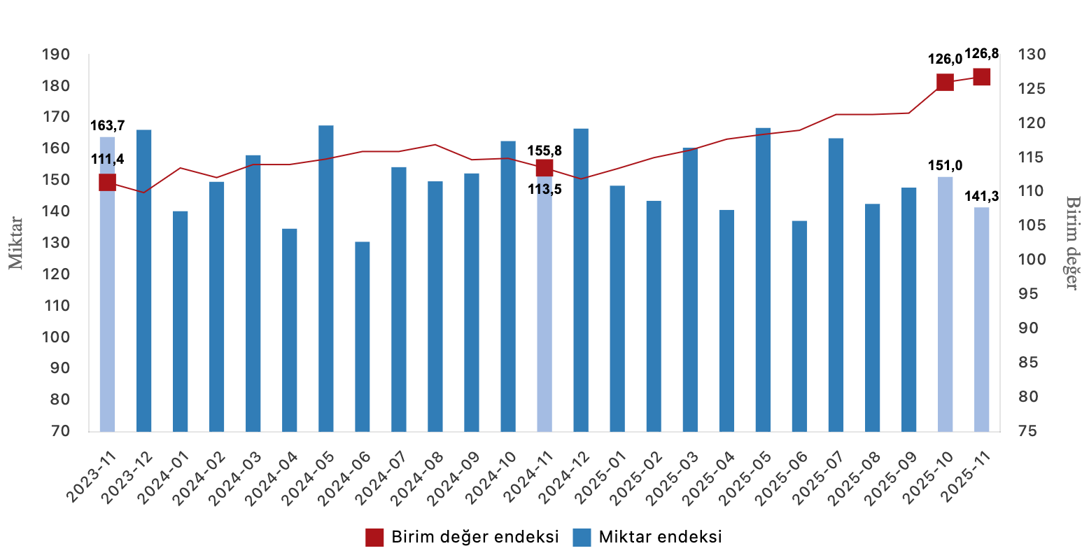 Türkiye İstatistik Kurumu’nun (TÜİK) verilerine göre, ihracat birim değer endeksi Kasım ayında bir önceki yılın aynı ayına göre yüzde 11,7 arttı. Endeks bir önceki yılın aynı ayına göre gıda, içecek ve tütünde yüzde 9,5 arttı, ham maddelerde (yakıt hariç) yüzde 9,5 arttı, yakıtlarda yüzde 4,2 azaldı, imalat sanayinde (gıda, içecek, tütün hariç) yüzde 13,2 arttı.