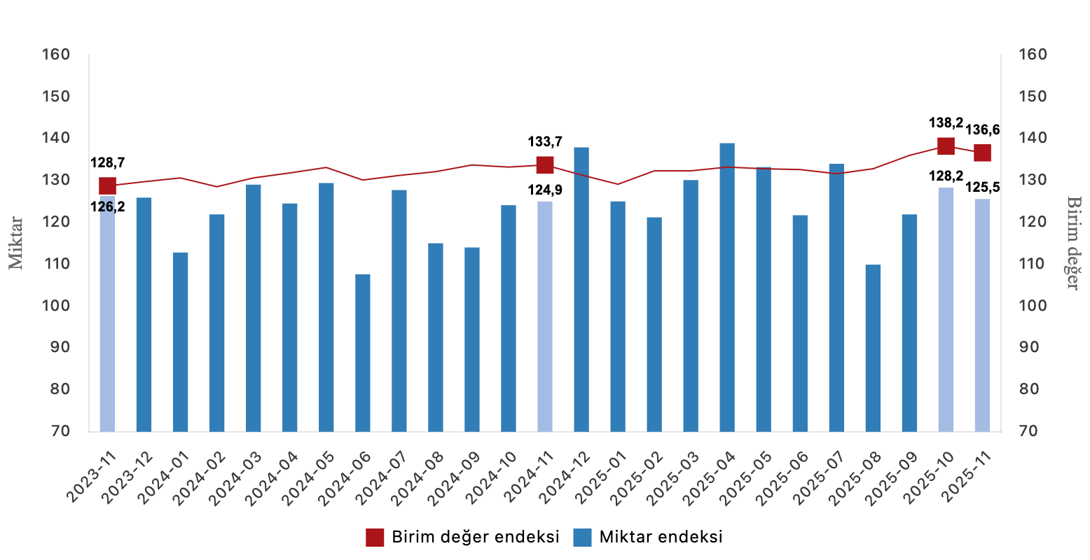 Mevsim ve takvim etkilerinden arındırılmış seriye göre ihracat miktar endeksi; 2025 Ekim ayında 138,2 iken 2025 Kasım ayında yüzde 3,6 oranında artarak 143,2 oldu. Takvim etkilerinden arındırılmış seriye göre ise ihracat miktar endeksi; 2024 yılı Kasım ayında 155,4 iken 2025 yılı Kasım ayında yüzde 5,6 oranında azalarak 146,7 oldu.