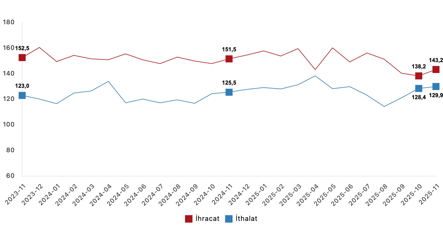 Mevsim ve takvim etkilerinden arındırılmış seriye göre ithalat miktar endeksi; 2025 Ekim ayında 128,4 iken 2025 Kasım ayında yüzde 1,2 oranında artarak 129,9 oldu. Takvim etkilerinden arındırılmış seriye göre ise ithalat miktar endeksi; 2024 yılı Kasım ayında 124,7 iken 2025 yılı Kasım ayında yüzde 3,5 oranında artarak 129,1 oldu.