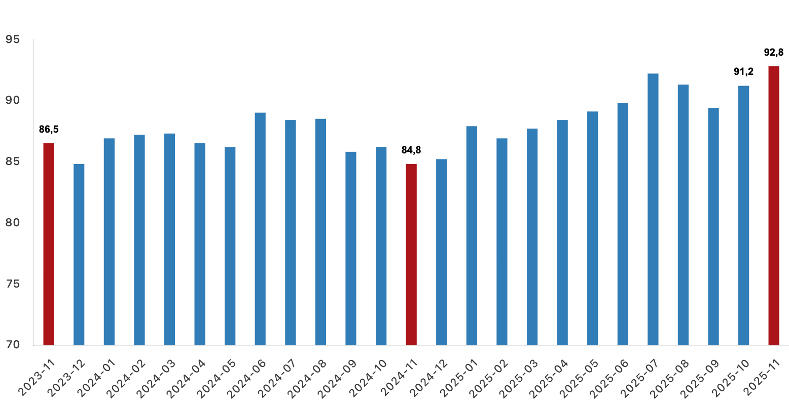 İhracat birim değer endeksinin ithalat birim değer endeksine bölünmesiyle hesaplanan ve 2024 yılı Kasım ayında 84,8 olarak elde edilmiş olan dış ticaret haddi, 8,0 puan artarak, 2025 yılı Kasım ayında 92,8 oldu.