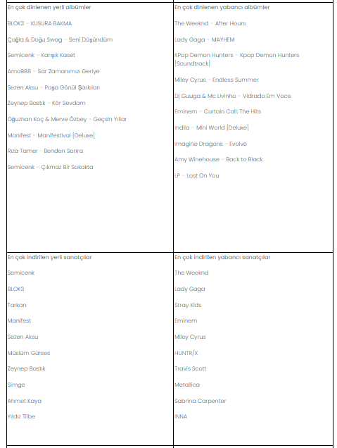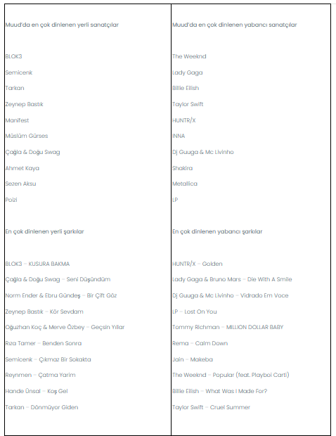 Muud kullanıcılarının favori listelerinde BLOK3 aralık ayının en dikkat çeken ismi oldu. En çok indirilen yerli sanatçı listesinde Semicenk zirveye yerleşirken, ödüllü sanatçı The Weeknd ise yabancı listelerde liderliğini korudu.