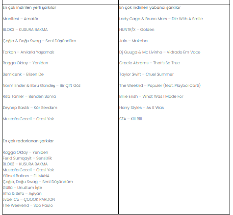 Aralık ayında Muud kullanıcıları müziği sadece dinlemekle kalmadı; ortamda duydukları şarkıları radarlayarak keşfetti, indirdi ve sevdikleriyle paylaştı. Muud radar özelliği kullanıcıların çevrelerinde çalan ve merak ettikleri şarkıları anında tanıyarak “bu şarkı neydi?” sorusuna hızlı bir yanıt verirken, onların yeni müzikleri kolayca keşfetmelerini sağladı. 2015 yılında piyasaya çıkan ancak yakın zamanda tekrar gündeme gelen Ragga Oktay’ın “Yeniden” şarkısı, ayın en çok radarlanan şarkısı oldu. Lady Gaga ve Bruno Mars’ın “Die With A Smile” düeti, ayın en çok indirilen yabancı şarkısı olarak öne çıktı. The Weeknd ise ay boyunca istikrarlı başarısını sürdürerek hem en çok dinlenen hem de en çok indirilen yabancı albüm listelerinde birinci sırada yer aldı.