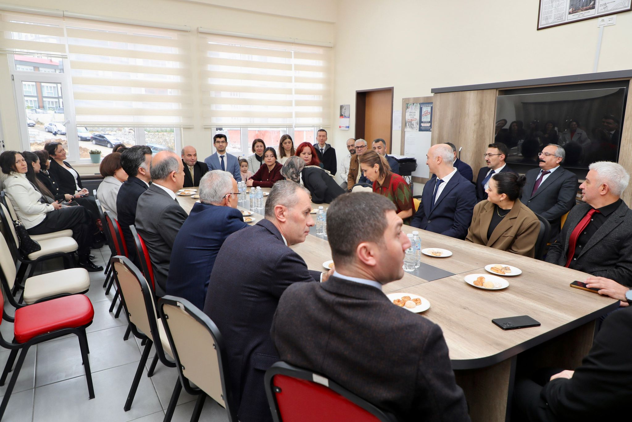 Erol, karne dağıtımı sonrası protokol üyeleri ile birlikte öğretmenler odasına geçerek, okul idarecileri ve öğretmenlerle bir araya geldi.