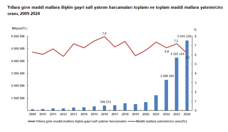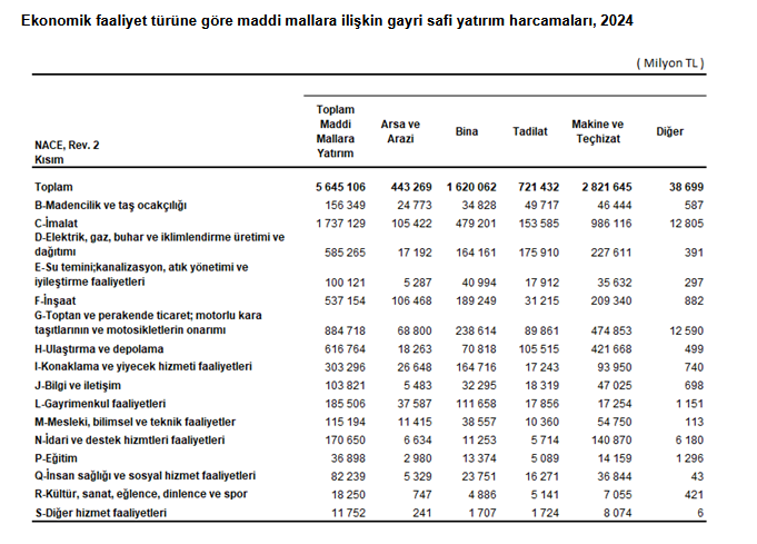 Türkiye İstatistik Kurumu’nun (TÜİK) verilerine göre, maddi mallara ilişkin gayri safi yatırım harcamaları 2024 yılında 5 trilyon 645 milyar TL olarak gerçekleşti. Maddi mallara ilişkin gayri safi yatırım harcamalarının 1 trilyon 737 milyar TL'si imalat sektöründe, 885 milyar TL'si toptan ve perakende ticaret sektöründe, 617 milyar TL'si ulaştırma ve depolama sektöründe faaliyet gösteren girişimler tarafından yapıldı.