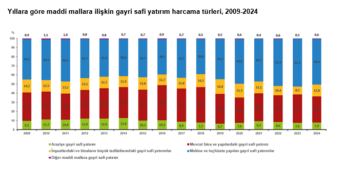 Maddi mallara ilişkin gayri safi yatırım harcamaları içerisinde en yüksek pay, makine ve teçhizata yapılan yatırımlar oldu. 2023 yılında makine ve teçhizat yatırımlarının maddi mallara ilişkin gayrisafi yatırım harcaması içindeki payı yüzde 52,3 iken 2024 yılında yüzde 50,0 olarak gerçekleşti. 2024 yılında Maddi mallara ilişkin gayrisafi yatırım harcaması içindeki payının en yüksek olduğu ikinci alan ise yüzde 28,7 ile mevcut bina ve yapılardaki yatırımlar oldu.