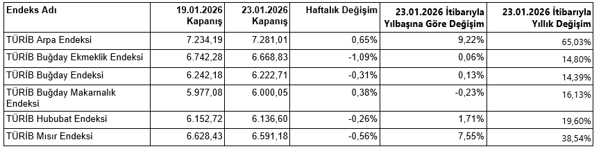 TÜRİB Buğday Endeksi: 19.01.2026 6.242,18 seviyesinde, 23.01.2026 günü ise 6.222,71 seviyesinde kapanmıştır. Haftalık değişim -yüzde 0,31, yıllık değişim yüzde 14,39 olmuştur.