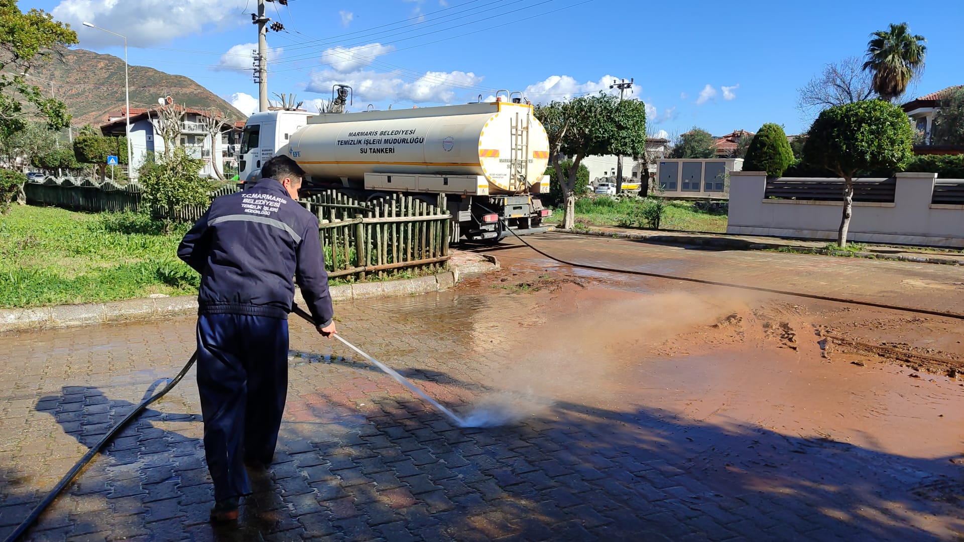 Selden etkilenen evlerin temizliğine destek veren ekipler, cadde ve sokaklarda yıkama çalışması yaptı.