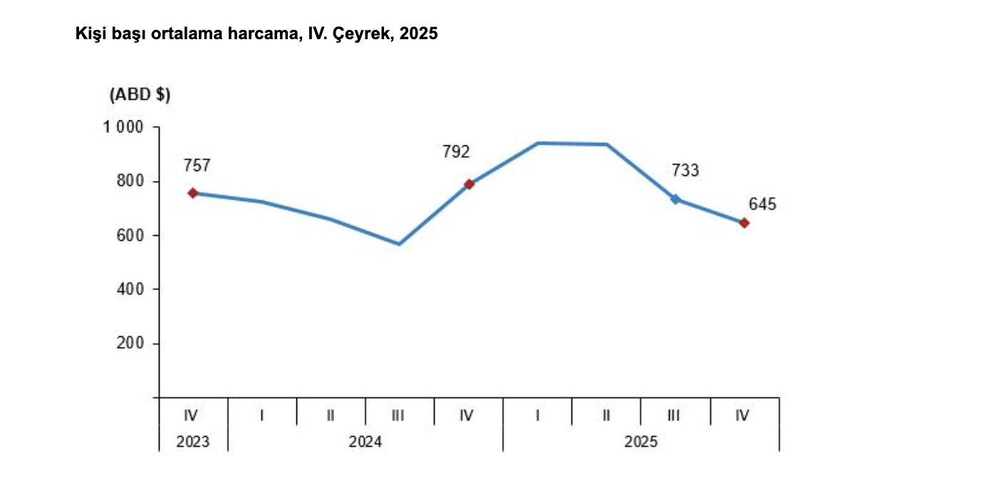 Ziyaretçi sayısı 2025 yılı IV. çeyreğinde bir önceki yılın aynı çeyreğine göre yüzde 5,9 artarak 14 milyon 744 bin 1 kişi oldu. Ziyaretçilerin yüzde 19,3'ünü 2 milyon 839 bin 596 kişi ile yurt dışında ikamet eden vatandaşlar oluşturdu. Bu çeyrekte ülkemizde geceleme yapan ziyaretçilerin gecelik ortalama harcaması 91 dolar oldu. Yurt dışında ikamet eden vatandaşların gecelik ortalama harcaması ise 57 dolar oldu.