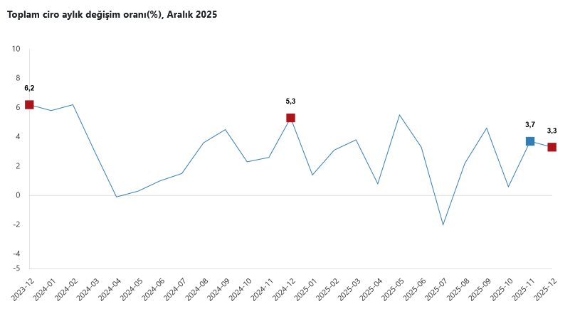 Sanayi, inşaat, ticaret ve hizmet sektörleri toplamında ciro endeksi (2021=100), 2025 yılı Aralık ayında aylık yüzde 3,3 yükseldi.