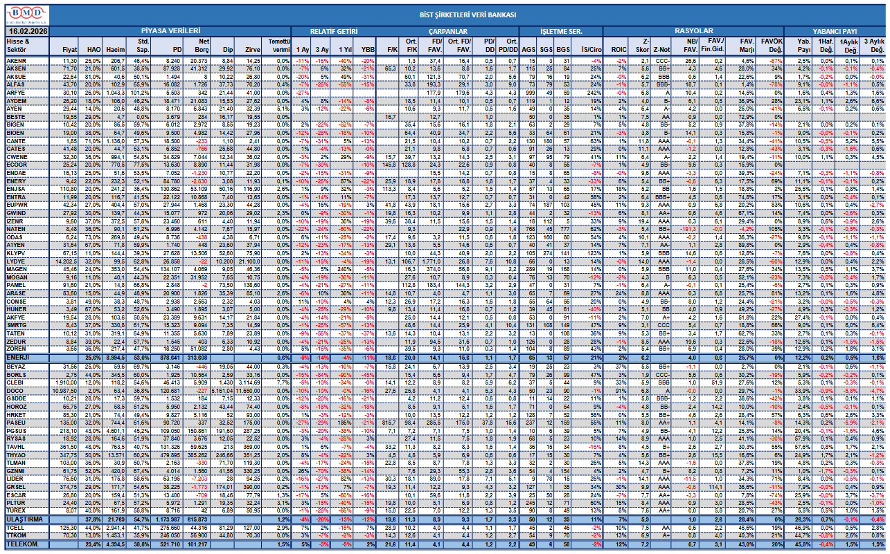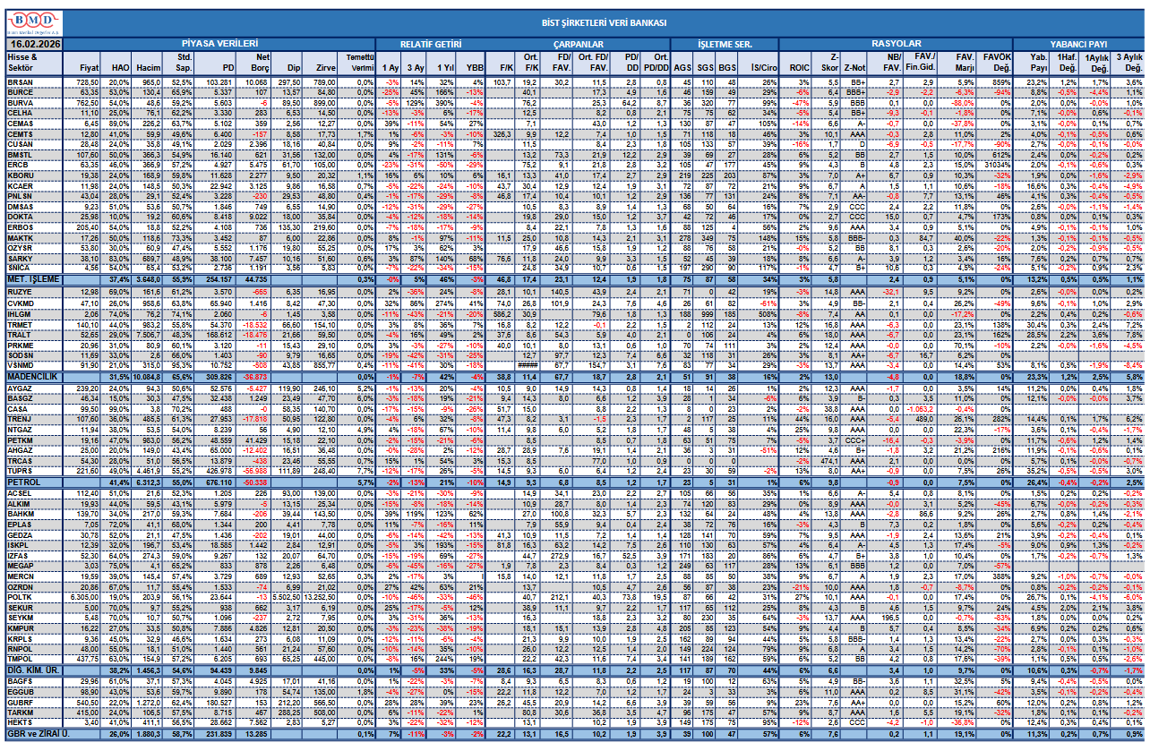 BMD Araştırma’nın raporunda göre, Borsa İstanbul’da işlem gören şirketlerin sektörleri, halka açıklık oranı, ortalama hacim, son bir yıllık dip ve zirve fiyatları gibi piyasa verilerini; BİST 100 endeksine göre göreceli getirilerini; F/K, FD/FAVÖK ve PD/DD çarpanlarının cari ve ortalama değerlerini; alacak stok ve borç gün süreleri ile işletme sermayesi/ciro oranını; ROIC, Z-Skor, Net Borç/FAVÖK gibi rasyoları ve yabancı payı değişimlerini gösteren veri bankası şu şekilde: