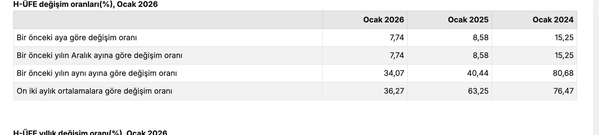 Türkiye İstatistik Kurumu’nun (TÜİK) verilerine göre, H-ÜFE 2026 yılı Ocak ayında bir önceki aya göre yüzde 7,74 artış, bir önceki yılın Aralık ayına göre yüzde 7,74 artış ve on iki aylık ortalamalara göre yüzde 36,27 artış gösterdi.