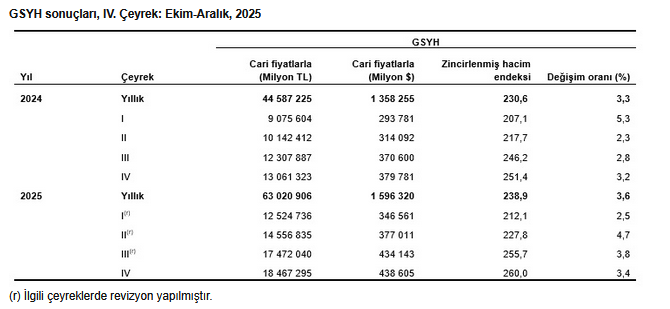 Türkiye İstatistik Kurumu (TÜİK) verilerine göre, üretim yöntemine göre dört çeyrek toplamıyla elde edilen yıllık GSYH, zincirlenmiş hacim endeksi olarak, 2025 yılında bir önceki yıla göre yüzde 3,6 arttı.