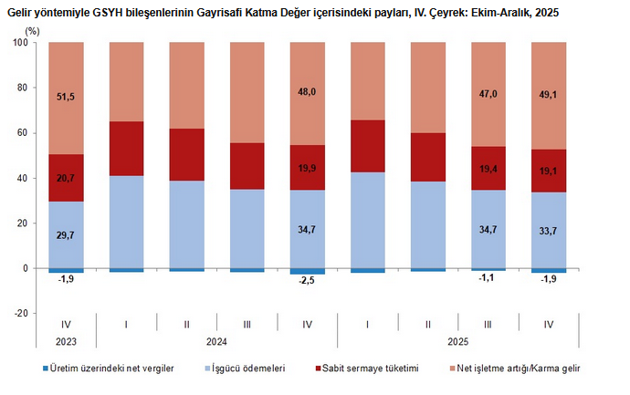 İşgücü ödemeleri 2025 yılında bir önceki yıla göre yüzde 40,4 artarken, net işletme artığı/karma gelir yüzde 44,2 arttı. 2025 yılının dördüncü çeyreğinde ise işgücü ödemeleri bir önceki yılın aynı çeyreğine göre yüzde 36,9 artarken, net işletme artığı/karma gelir yüzde 44,2 arttı.